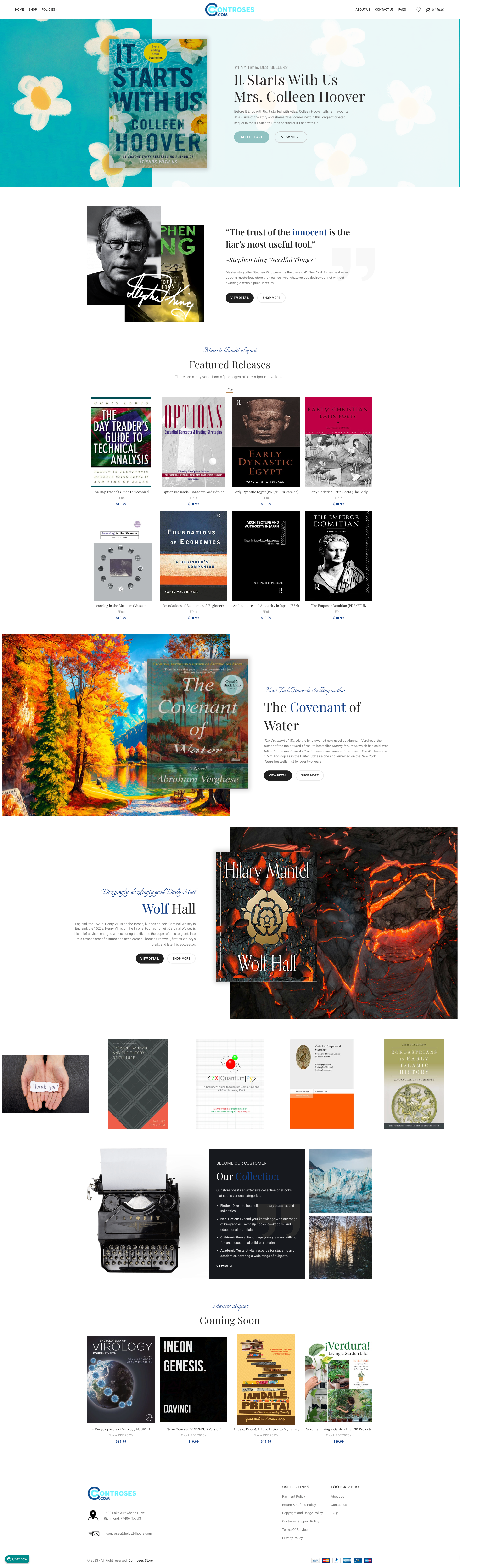 Controses is a minimalist online bookstore with a clean, user-friendly layout. The homepage highlights featured books in a prominent slider, followed by quick-view sections for easy browsing. A neutral white background emphasizes vibrant book covers, while contrasting buttons enhance navigation. The site uses a modern, cohesive design with intuitive menus for a seamless shopping experience.